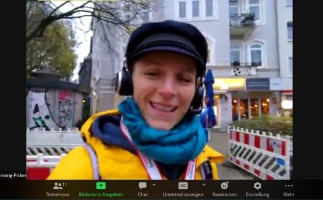 Pendant la visite, vous pouvez poser des questions via le chat ou avec le microphone activé à cet effet, ou me faire changer de direction en tant que votre guide:in à Hambourg. La connexion en ligne se fait via Zoom ou MS-Teams et me permet également de vous montrer des photos pendant la visite.